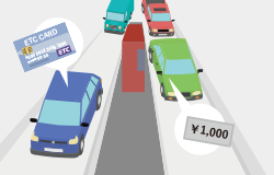 ETCレーンで無線通信により一旦停止することなく、ETCカードによる通行料金の支払いがされますので、料金所通過時間の短縮やキャッシュレス化が実現します。