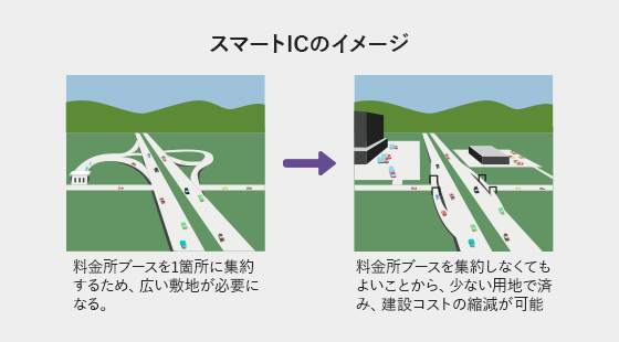 従来の料金支払いシステムでは、料金所を1箇所に集約するため、広い敷地の大規模な構造のインターチェンジが必要でしたが、ETCを活用すれば、処理能力が大きく、料金所を集約する必要もないので、コンパクトな料金所構造が可能になり、地域の実情に即してインターチェンジを追加することも容易になります。